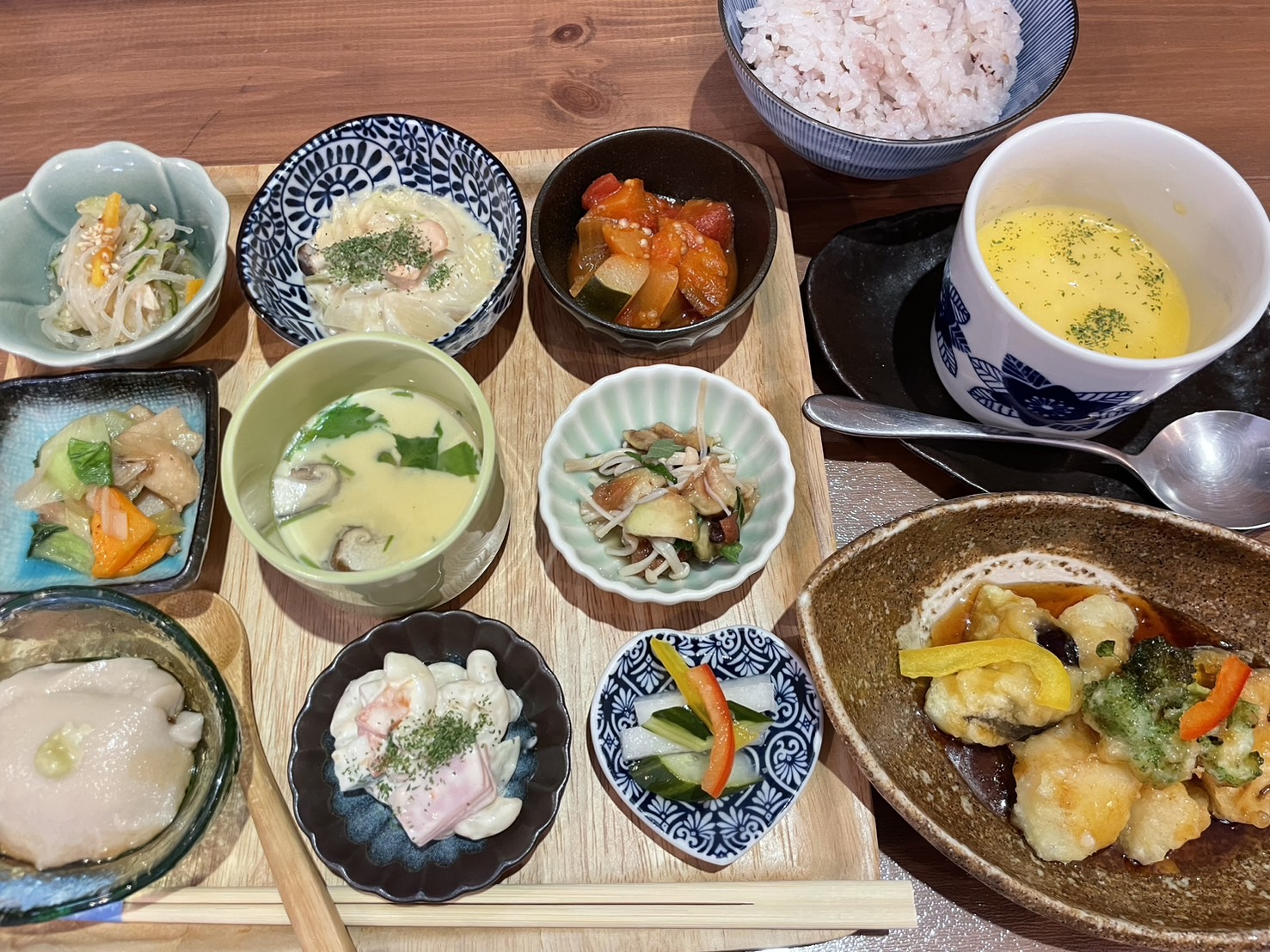 選べるメイン1品、9種類もの豆皿おかず、十六穀ごはんと季節のスープがついたほんとにもう大満足のランチです!
